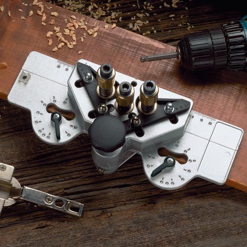 Use your drill and the ball-tipped hex driver to drill all threee holes quickly and easily without changing bits. Ideal for large projects. Accommodates most 35mm hinges plus you get 8 tab-depth settings. A built-in clamp holds the jig in place. 35mm cup and two 7/64" pilot hole drill bits included.